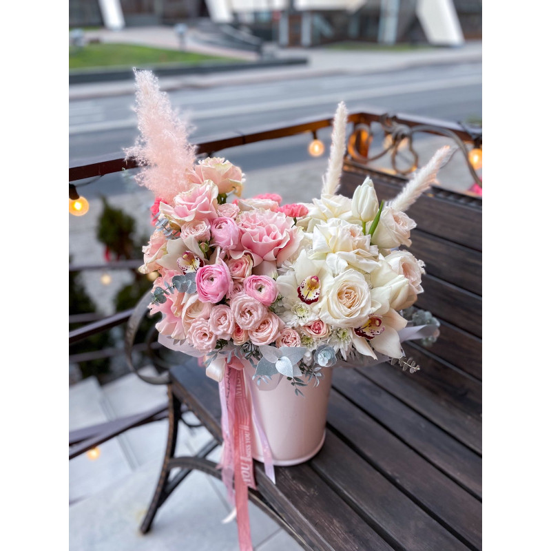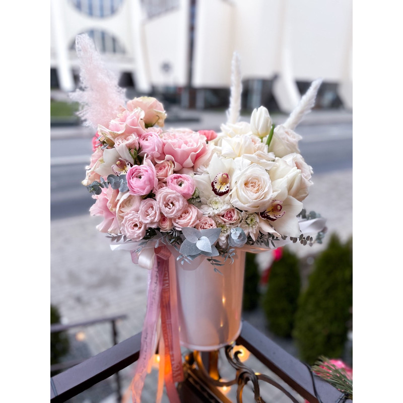 Цилиндр из одноголовой французской розы, кустовой розы, ранункулюса, цимбидиума, хризантемы, тюльпанов, пионовидной розы White O’hara, сухоцветов и зелени.