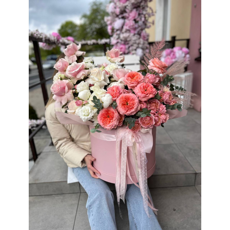 Цилиндр из пионовидных одноголовых роз, французской розы, кустовой розы Джульетта, эустомы, кустовой пионовидной розы, сухоцветов и зелени.