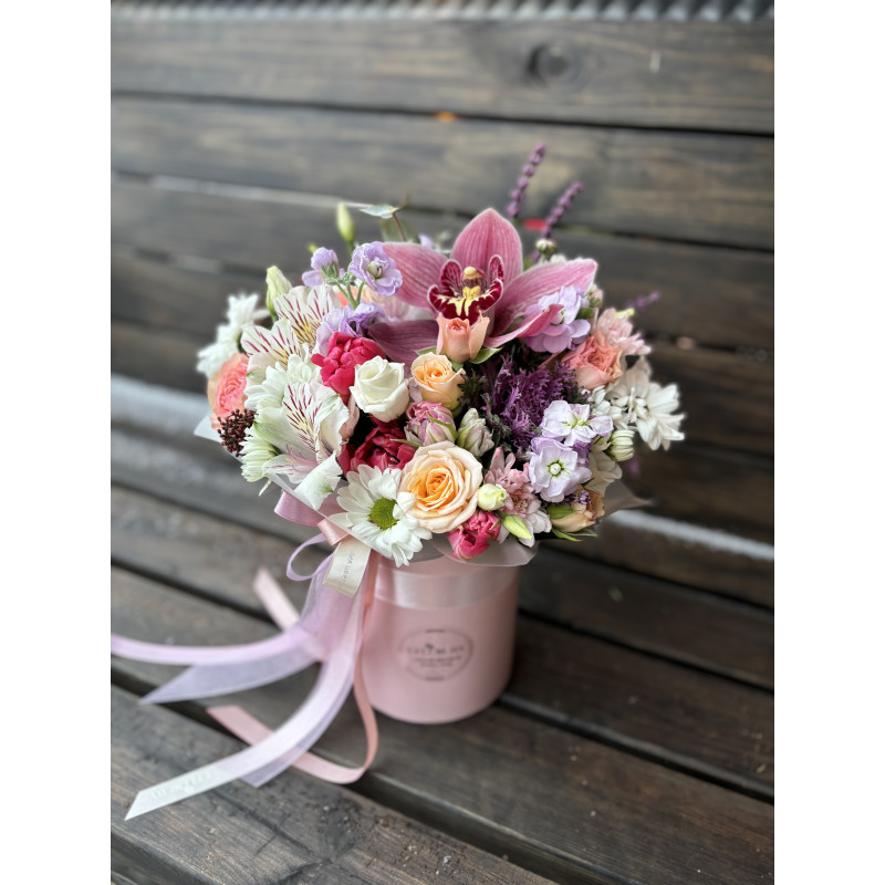 Цилиндр из кустовых пионовидных роз Джульетта, кустовые розы других сортов, альстромерии, цимбидиума, хризантемы, ромашки, матиоллы и зелени.