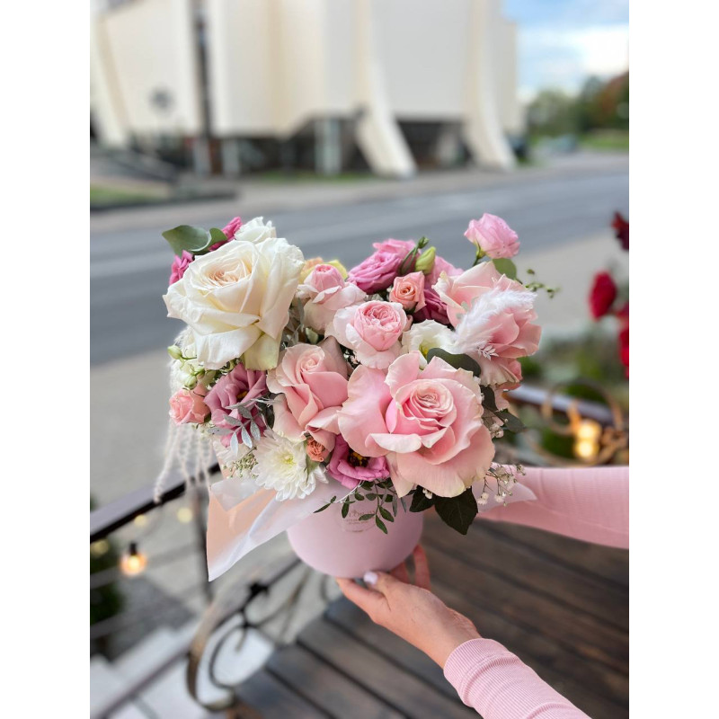 Цилиндр из французской розы, пионовидной розы White O’hara, эустомы, хризантемы, кустовой розы, гипсофила, сухоцветов и зелени.