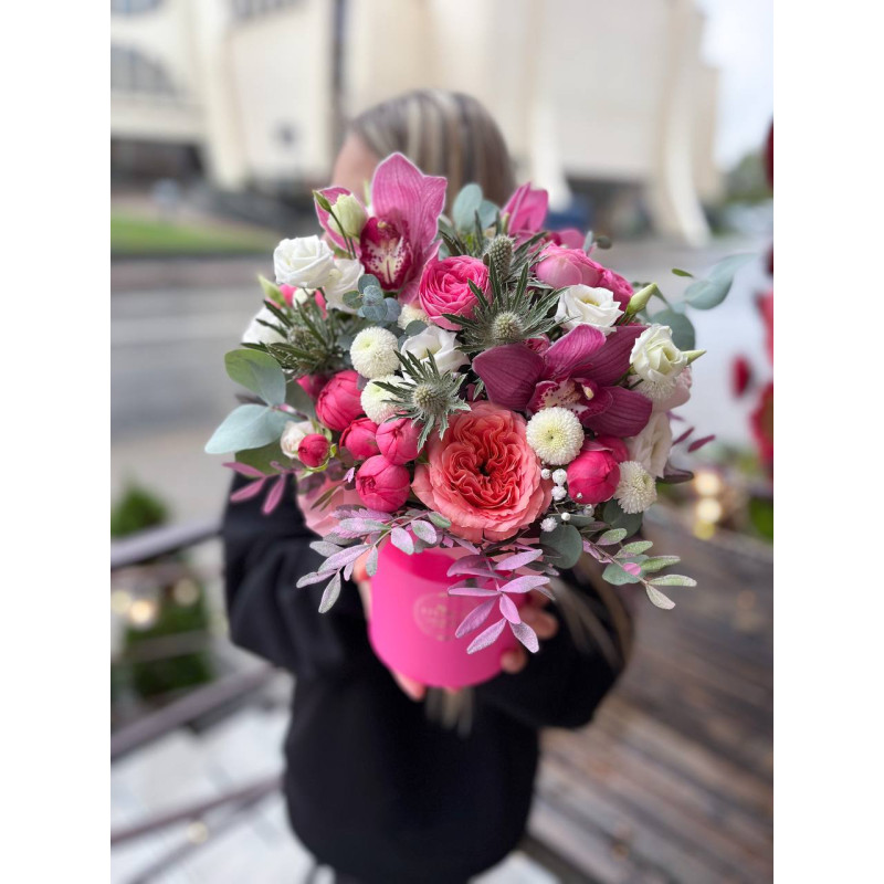Цилиндр из кустовой розы, цимбидиума, пионовидной одноголовой розы, хризантемы коконут,эустомы, эрингиума, гипсофила и зелени.