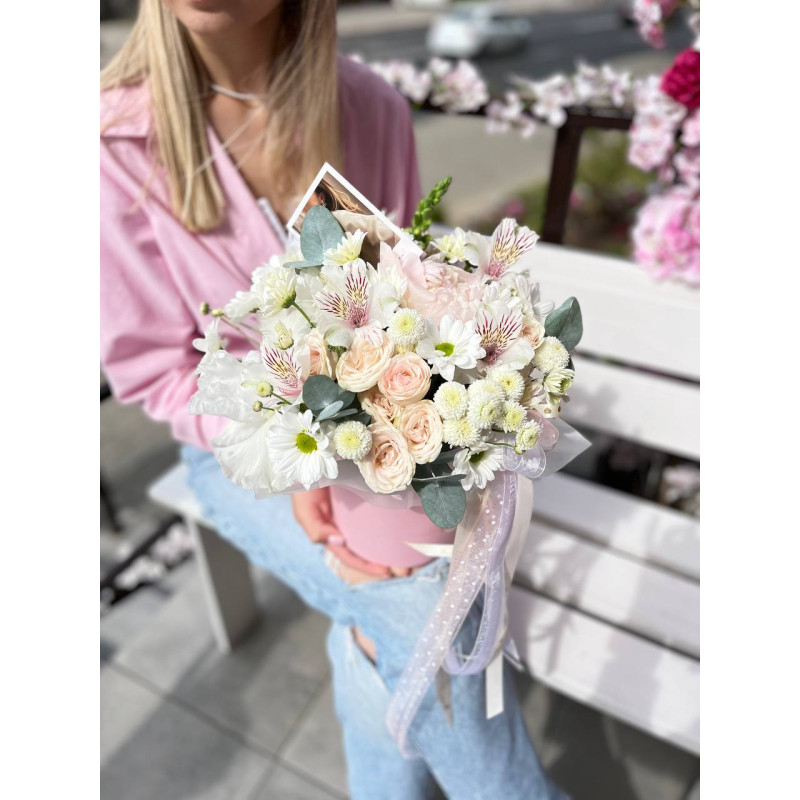 Цилиндр из кустовой розы, альстромерии, хризантемы, ромашки и зелени.