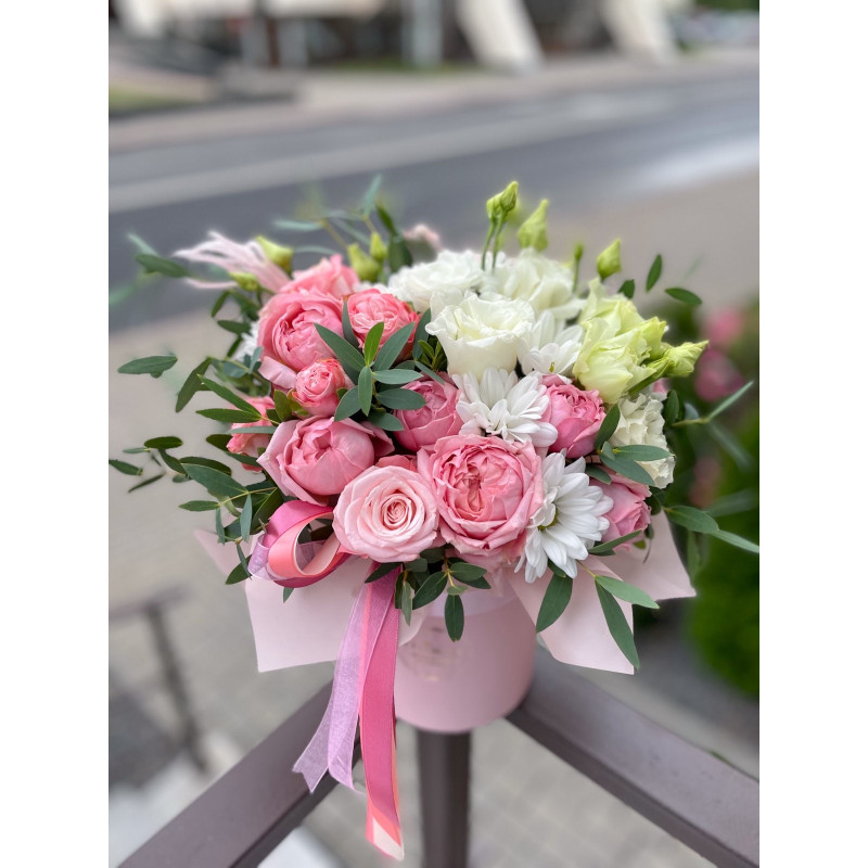 Цилиндр из кустовой пионовидной розы Джульетта, хризантемы ромашковой, эустомы, сухоцветов и зелени.