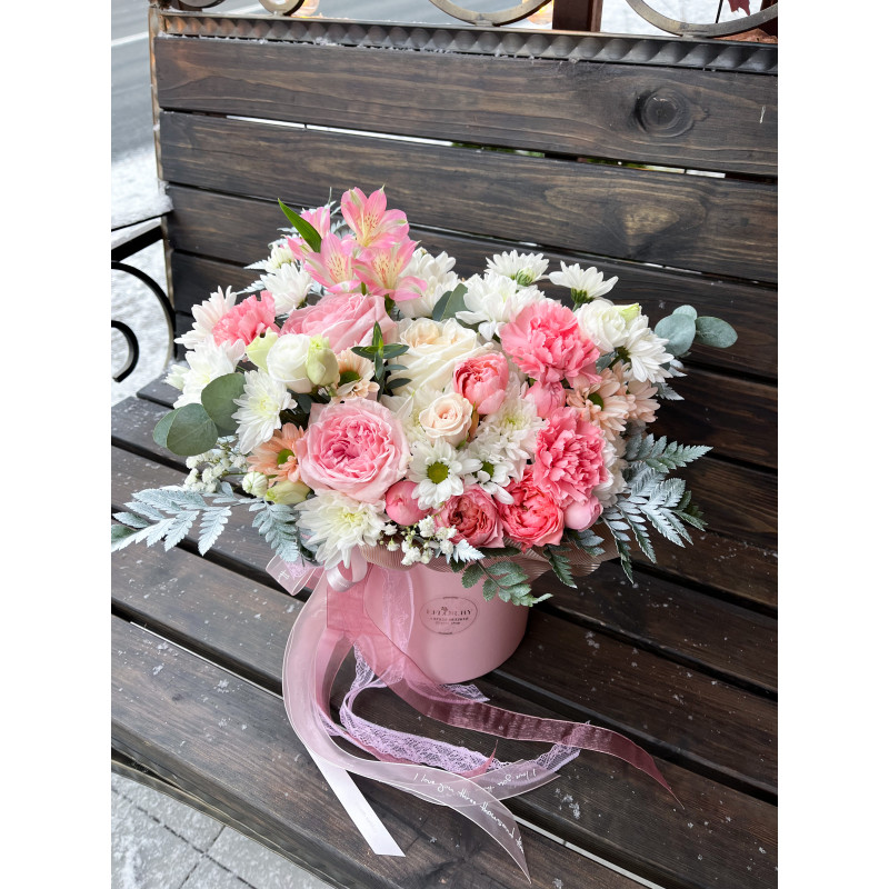 Цилиндр из одноголовой пионовидной розы White O'hara, альстромерии, хризантемы, кустовой розы Джульетта, эустомы, гипсофилы, диантуса и зелени.