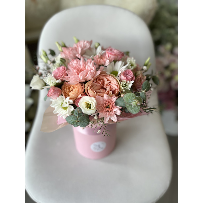 Цилиндр из кустовой пионовидной розы Джульетта, хризантемы крашенной, ромашки, эустомы, кустовой розы Bombastic, хамелациума и зелени. Цветы в цилиндре находятся в оазисе(флористическая губка), пропитанной водой. Каждые 2-3 дня нужно добавлять немного воды в губку. Схожесть композиции 80%, в зависимости от наличия цилиндра и сезонности цветов.