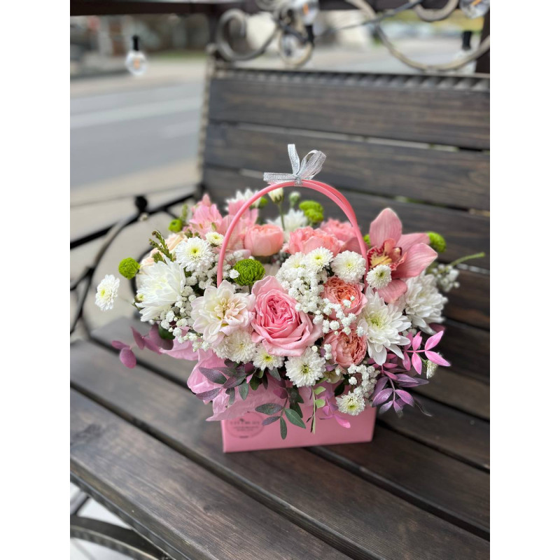 Сумочка из кустовых пионовидных роз Джульетта, пионовидной розы Pink O’hara, хризантемы, цимбидиум, гипсофил, хризантема коконут и зелени.