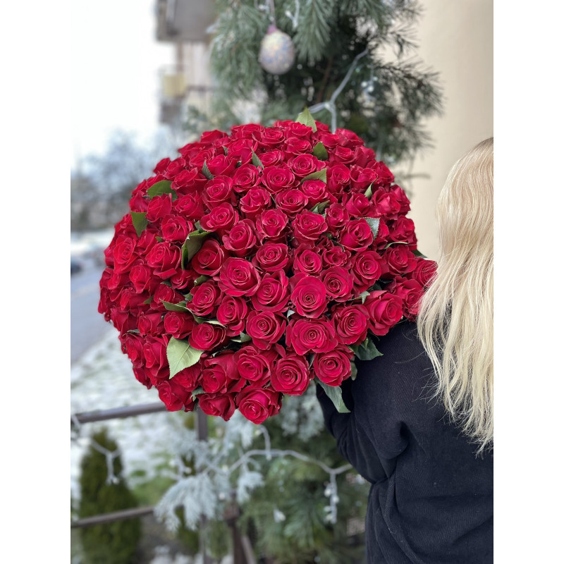 Моно букет из 101 красной одноголовой розы Фридом на ленте. Схожесть букета 80%, в зависимости от наличия цветов и упаковки.