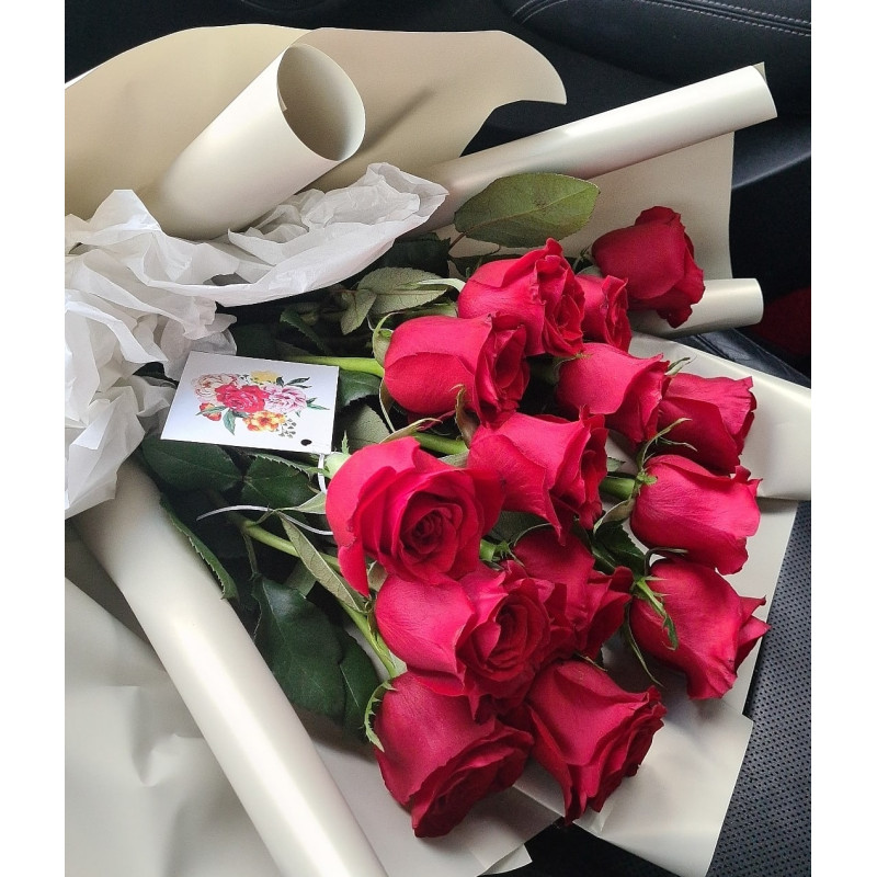 Моно букет из 15 одноголовых красных роз Мондиаль в стильной упаковке. Схожесть букета 80%, в зависимости от наличия цветов и упаковки.