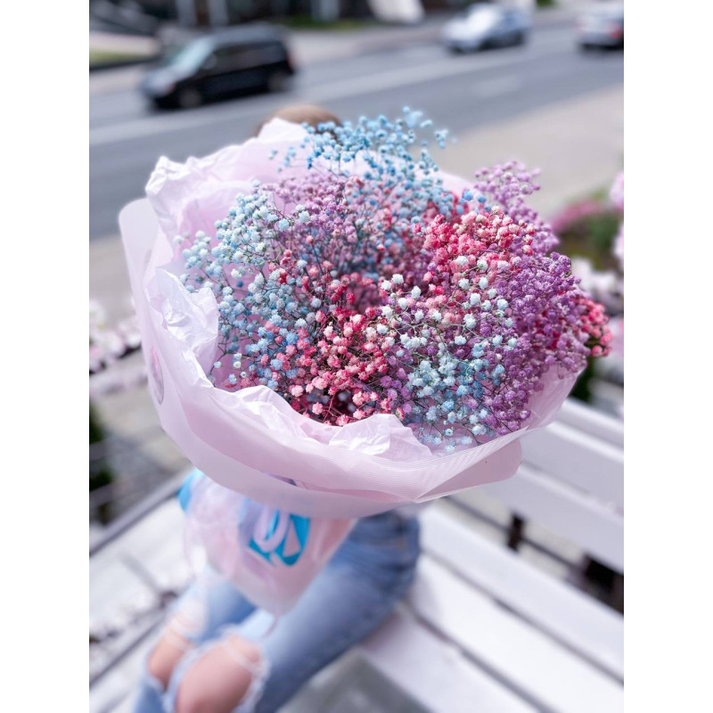 Моно букет из 11 веток крашенного гипсофила в стильной упаковке.