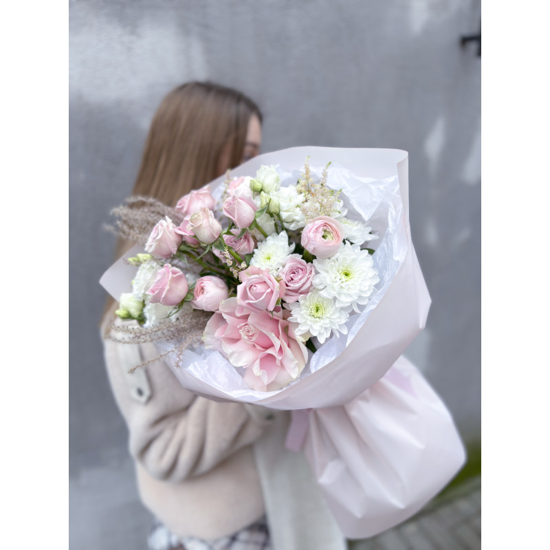Сборный букет из одноголовой французской розы, кустовой розы, эустомы, хризантемы и зелени в стильной упаковке.