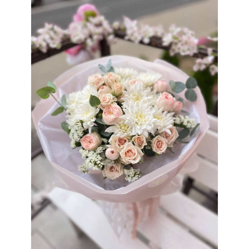 Сборный букет из кустовых роз двух сортов и хризантемы с зеленью в стильной упаковке.
