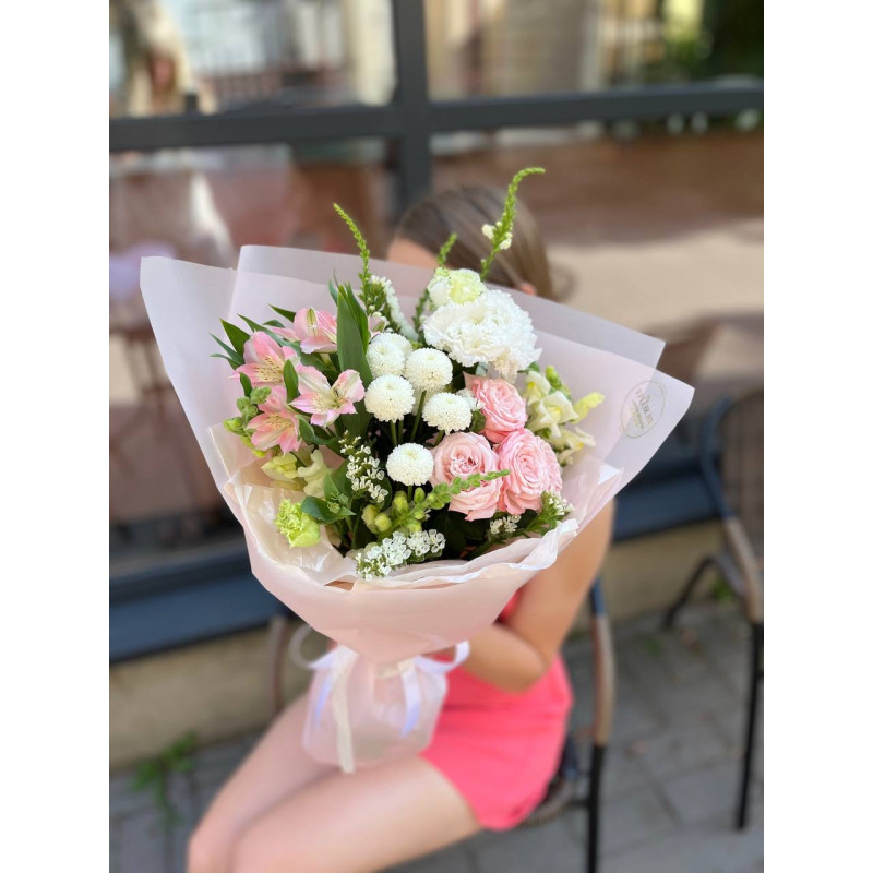 Сборный букет из хризантемы коконут, кустовой розы Bombastic, альстромерии, эустомы махровой и зелени в стильной упаковке.