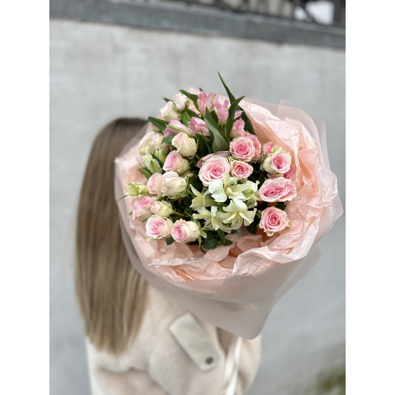 Сборный букет из кустовой розы, альстромерии и зелени в стильной упаковке.