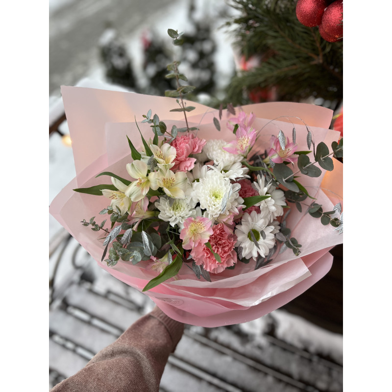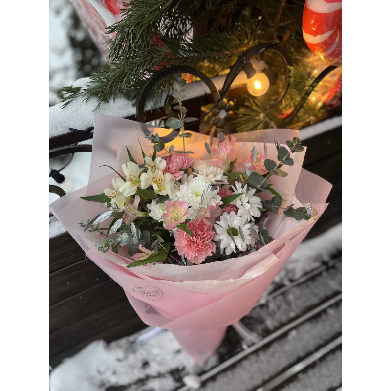 Сборный букет из диантуса, хризантемы, ромашковой хризантемы, альстромерии и эвкалипта в стильной упаковке.