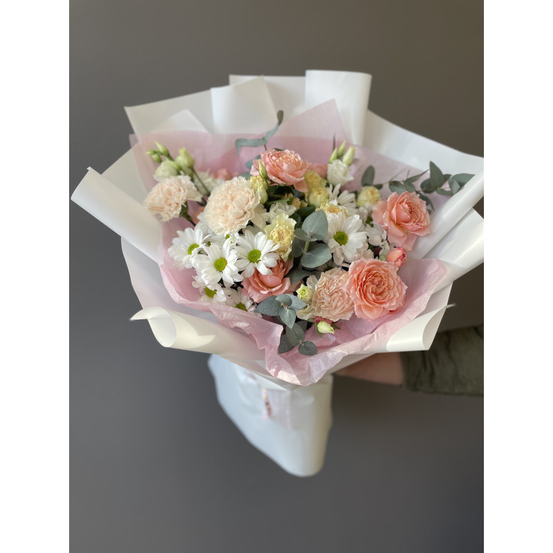Сборный букет из ромашки, кустовой пионовидной розы Джултетта, гвоздики персиковой, эустомы белой, кустовой персиковой розы и зелени в стильной упаковке.