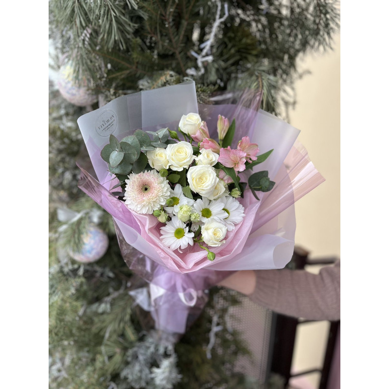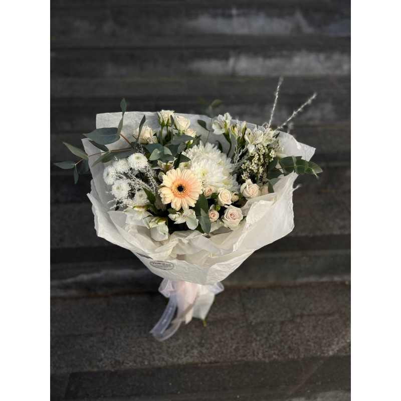 Сборный букет из кустовой розы, хризантемы, альстромерии, герберы, хризантемы коконут, хамелациума и зелени в стильной упаковке.
