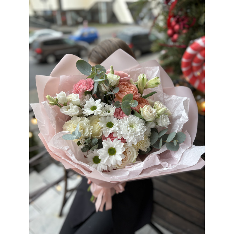 Сборный букет из хризантемы, эустомы, ромашки, диантуса, альстромерии, кустовой пионовидной Джульетта, пионовидной розы White O’hara и зелени в стильной упаковке.